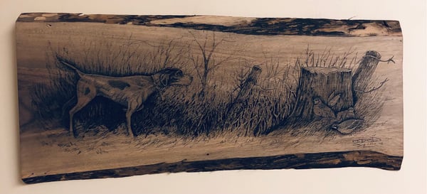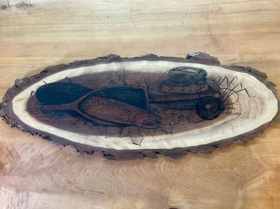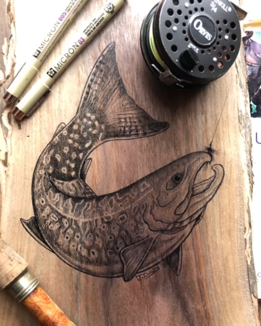 Trout Scene on 28”x 10.5” Live Edge Walnut plank.